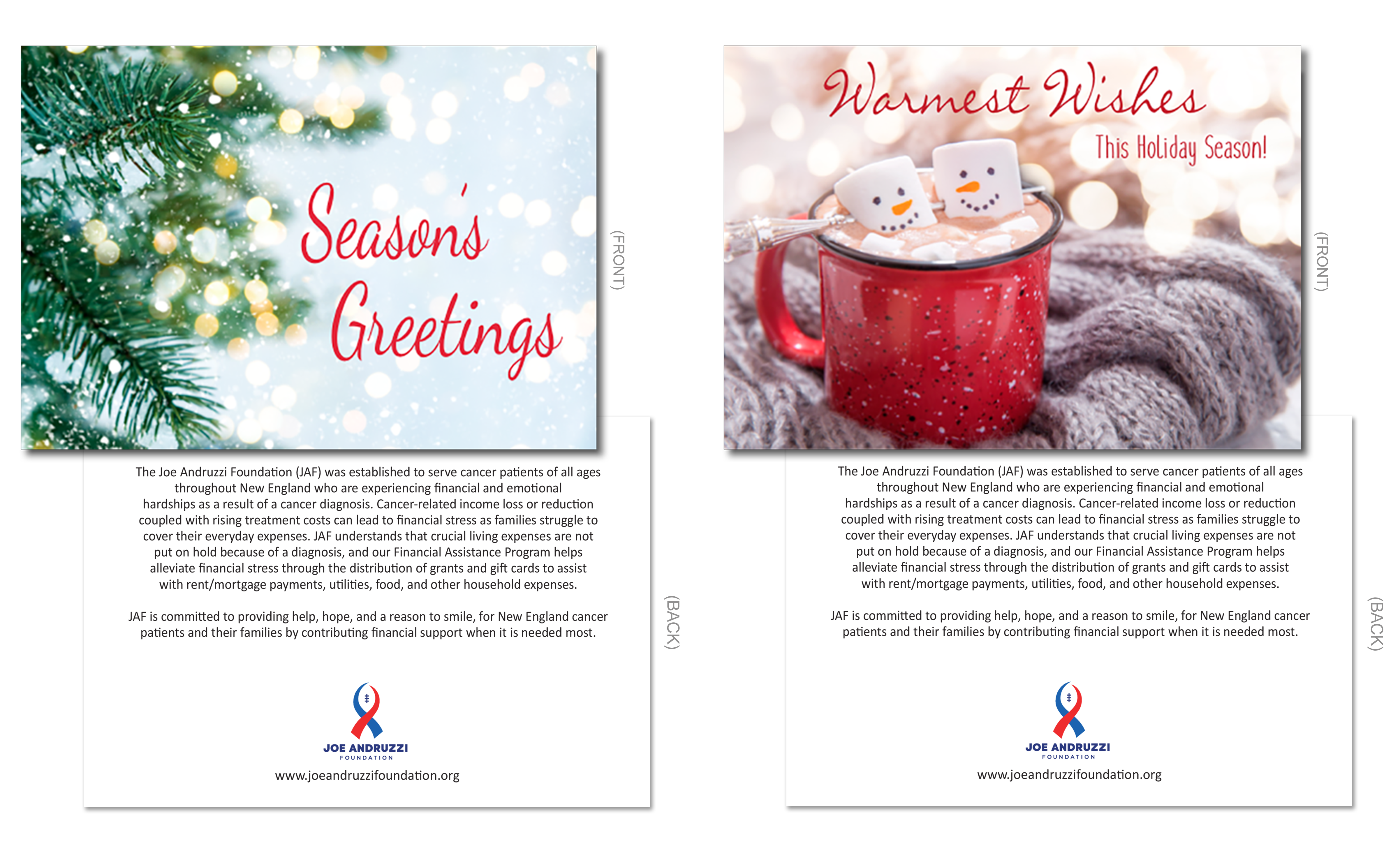 Simply make a donation to JAF through this special program (HERE) and your loved one will receive a beautiful holiday card from the Joe Andruzzi Foundation with a personal message from you, alerting them of your gift and the true impact created in their honor.